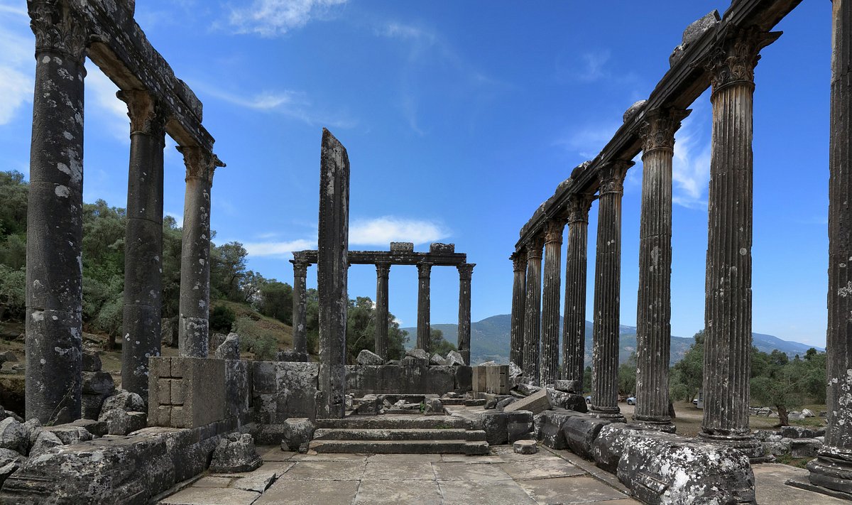 Begin at Euromos, renowned for the remarkably well-preserved Temple of Zeus Lepsynos. Admire its towering Corinthian columns, which remain standing after nearly two millennia, and explore the surrounding ruins including the theatre, agora, and city walls. The peaceful rural setting enhances the site’s authentic and uncrowded atmosphere.